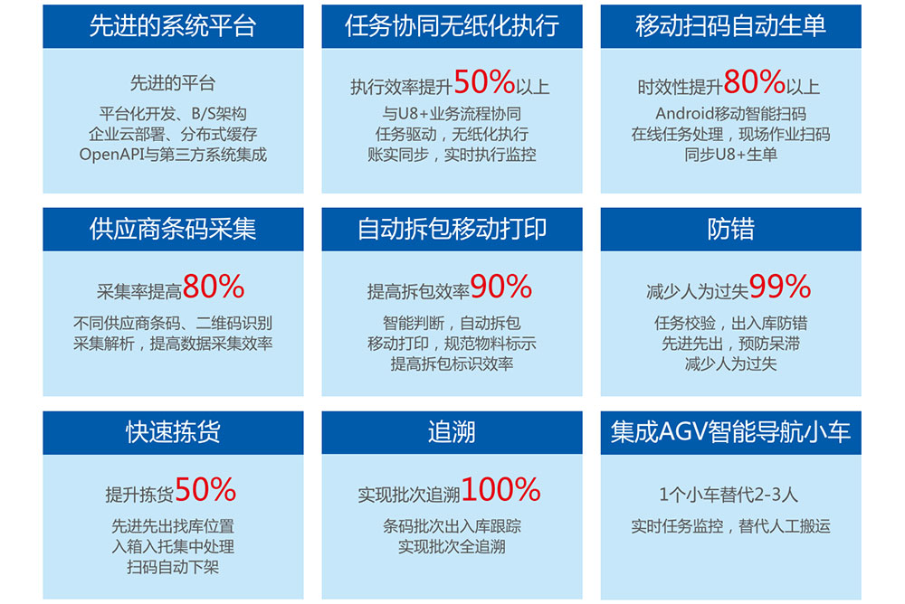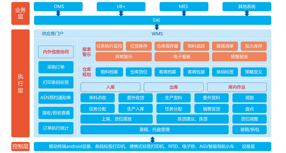 公司技术WMS仓储执行管理系统采用最新的信息网络技术,通过条码/RFID技术、移动打印、二维码解析、AGV智能导航小车及先进生产管理理念,能够有效的对仓库流程和空间利用进行管理,实现最小包装跟踪管理、批次管理、先进先出管理、快速扫码出入库和动态盘点,提高企业仓库空间利用率及员工工作效率。